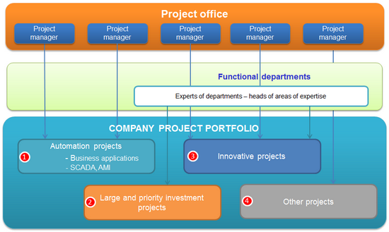 Currently, IDGC of Centre for the implementation of the most important targets uses project management technologies, based on the requirements of the standard «Guidelines for project activity» of the Company. The need for the implementation of a number of important tasks with the use of project methods is driven by the requirement to achieve target values of key performance indicators identified in the strategy of the Company. In this regard, the Company’s Management sees the need to take a number of measures to reform and improve business processes. It results in a number of tasks to solve which it needs to mobilize additional human and financial resources. Its own staff, performing project tasks in parallel with the main functional responsibilities by increasing the productivity of their labour, is considered the main source of workforce involved in projects. Coordination of activities to make a list of projects of the Company and its implementation is carried out by the Project Management Office.
